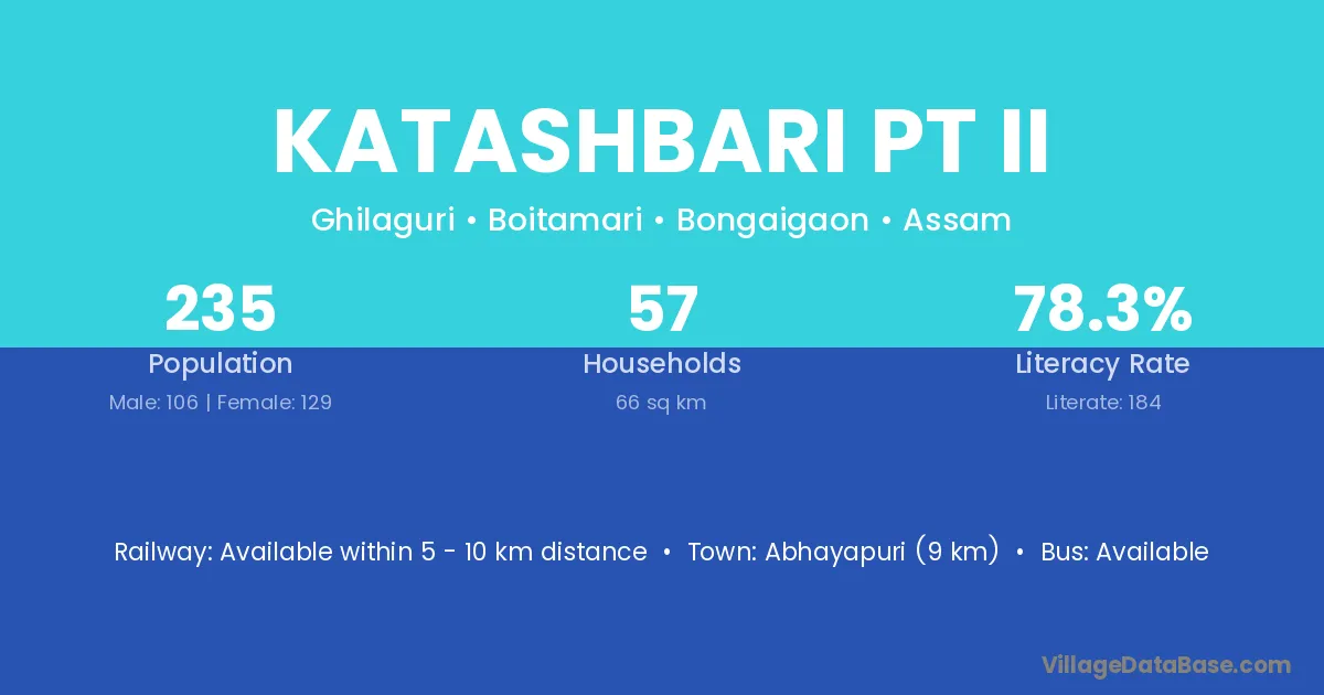 Abhayapuri (9 km) is the nearest town to Katashbari Pt Ii village for major economic activities and is located approximately 9 km away.
