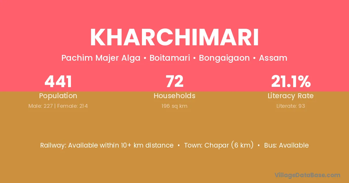 Chapar (6 km) is the nearest town to Kharchimari village for major economic activities and is located approximately 6 km away.