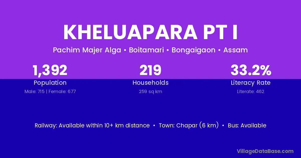 Chapar (6 km) is the nearest town to Kheluapara Pt I village for major economic activities and is located approximately 6 km away.