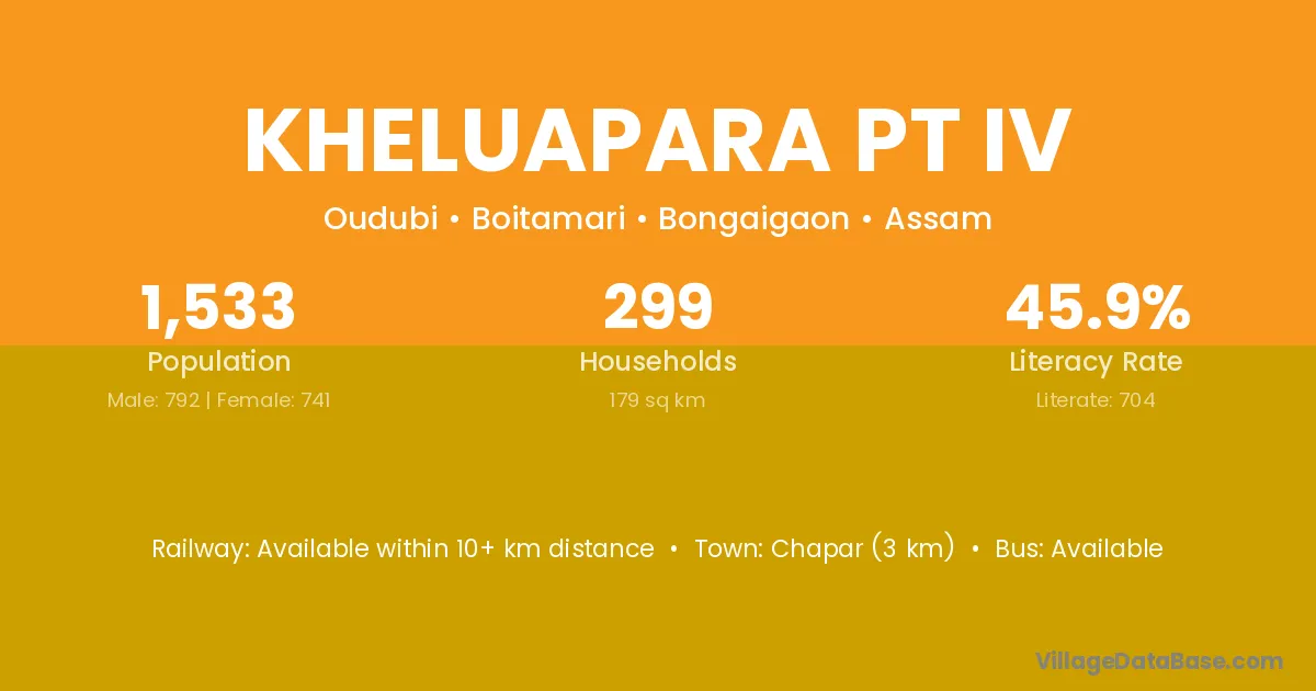 Chapar (3 km) is the nearest town to Kheluapara Pt Iv village for major economic activities and is located approximately 3 km away.