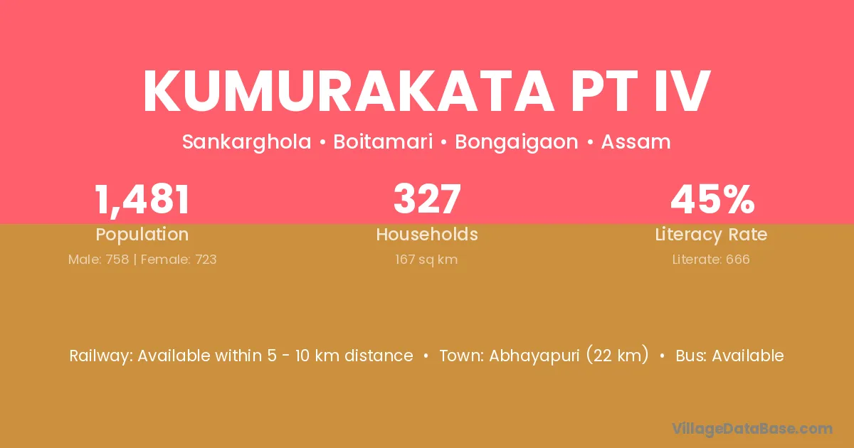 Abhayapuri (22 km) is the nearest town to Kumurakata Pt Iv village for major economic activities and is located approximately 22 km away.