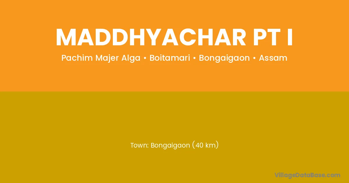 Bongaigaon (40 km) is the nearest town to Maddhyachar Pt I village for major economic activities and is located approximately 40 km away.