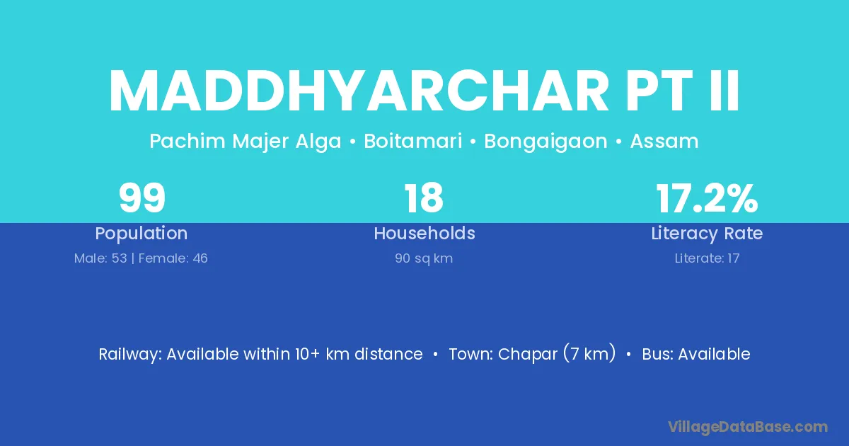 The literacy rate of Maddhyarchar Pt Ii village is 17.17%. Male literacy stands at 16.98% and female literacy at 17.39%.