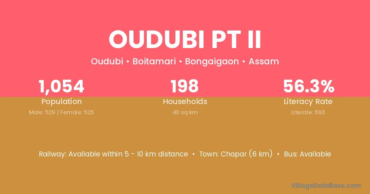 Chapar (6 km) is the nearest town to Oudubi Pt Ii village for major economic activities and is located approximately 6 km away.