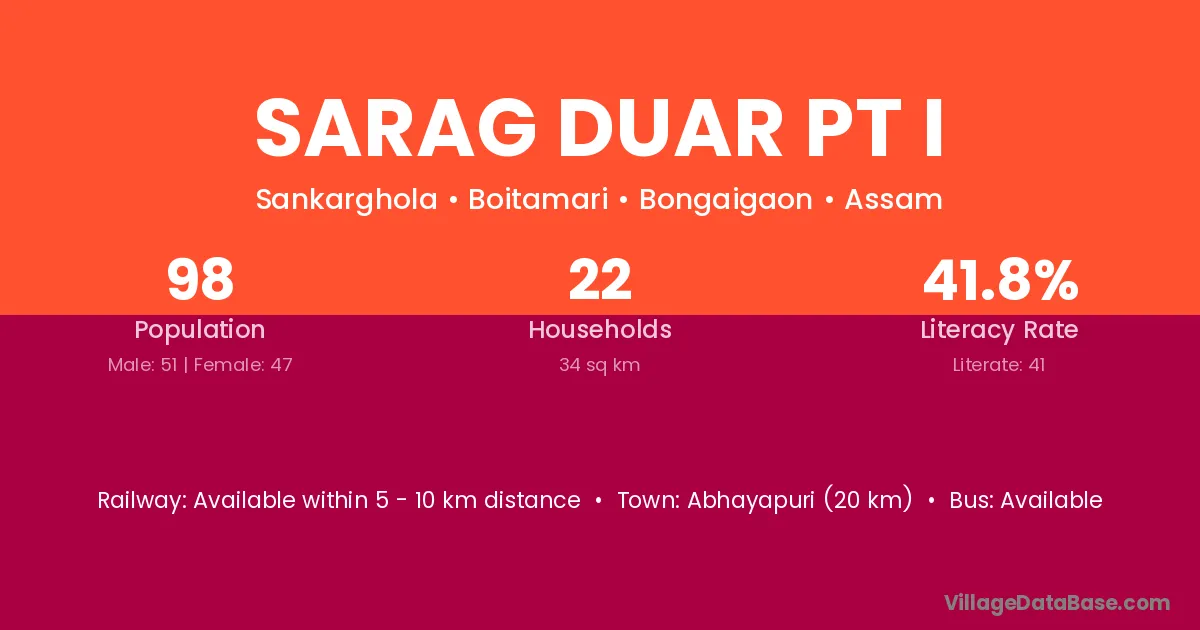 Sarag Duar Pt I village has a total population of 98 people, of which 51 are males and 47 are females.