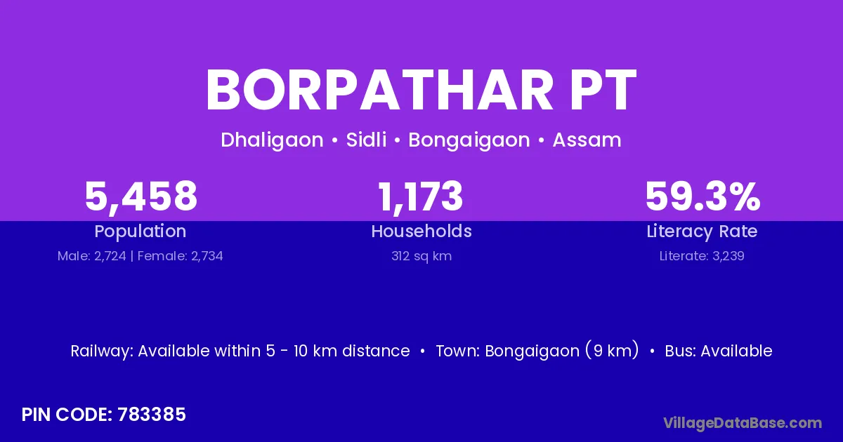 Bongaigaon (9 km) is the nearest town to Borpathar Pt village for major economic activities and is located approximately 9 km away.