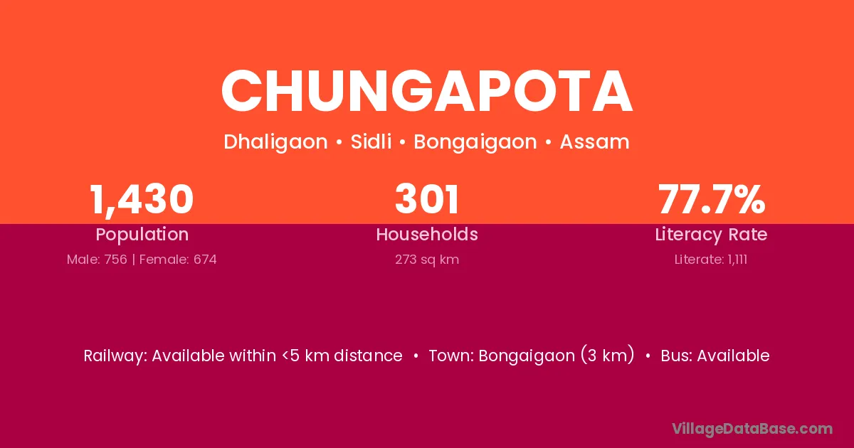 Bongaigaon (3 km) is the nearest town to Chungapota village for major economic activities and is located approximately 3 km away.