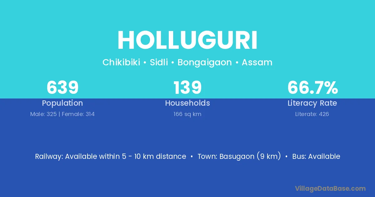 Basugaon (9 km) is the nearest town to Holluguri village for major economic activities and is located approximately 9 km away.