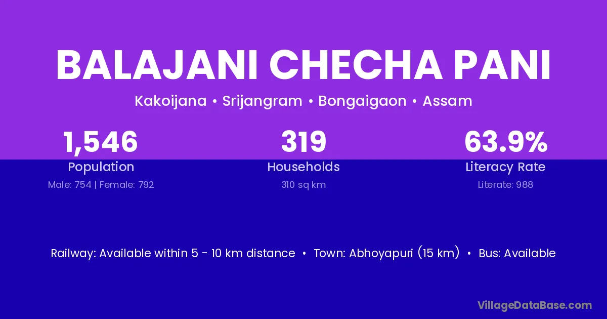 Abhoyapuri (15 km) is the nearest town to Balajani Checha Pani village for major economic activities and is located approximately 15 km away.