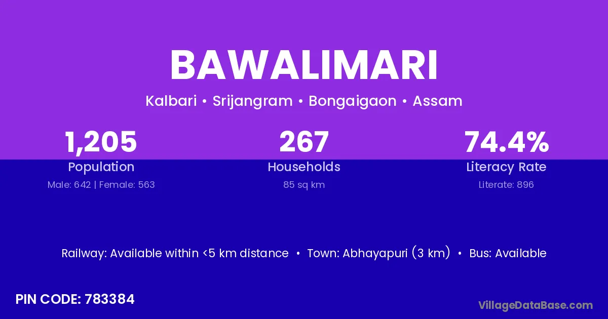 Abhayapuri (3 km) is the nearest town to Bawalimari village for major economic activities and is located approximately 3 km away.