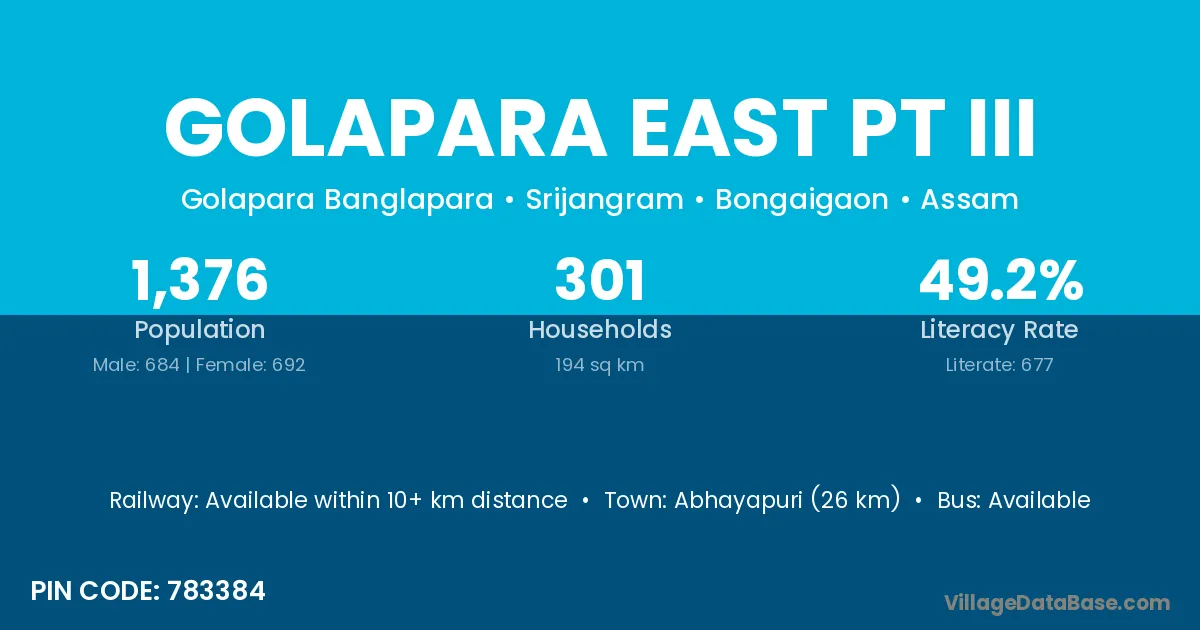 Abhayapuri (26 km) is the nearest town to Golapara East Pt Iii village for major economic activities and is located approximately 26 km away.