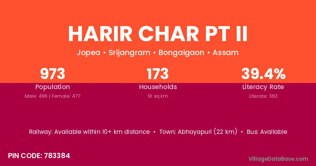 Harir Char Pt Ii village has a total population of 973 people, of which 496 are males and 477 are females.