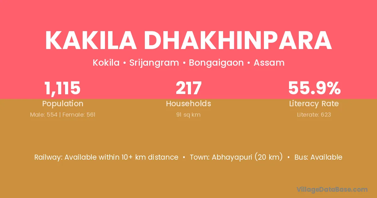 Abhayapuri (20 km) is the nearest town to Kakila Dhakhinpara village for major economic activities and is located approximately 20 km away.
