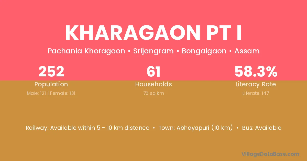 Abhayapuri (10 km) is the nearest town to Kharagaon Pt I village for major economic activities and is located approximately 10 km away.