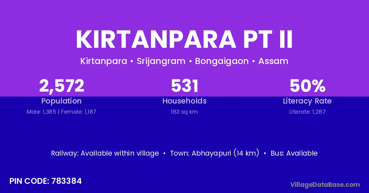 Abhayapuri (14 km) is the nearest town to Kirtanpara Pt Ii village for major economic activities and is located approximately 14 km away.