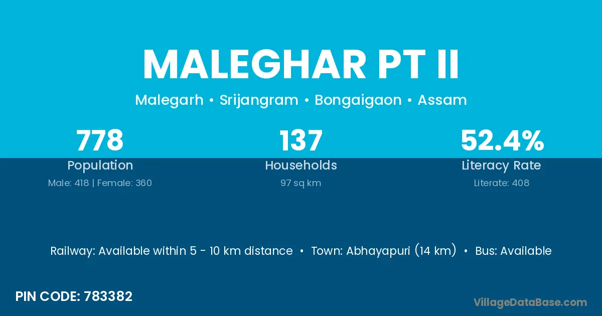 Abhayapuri (14 km) is the nearest town to Maleghar Pt Ii village for major economic activities and is located approximately 14 km away.