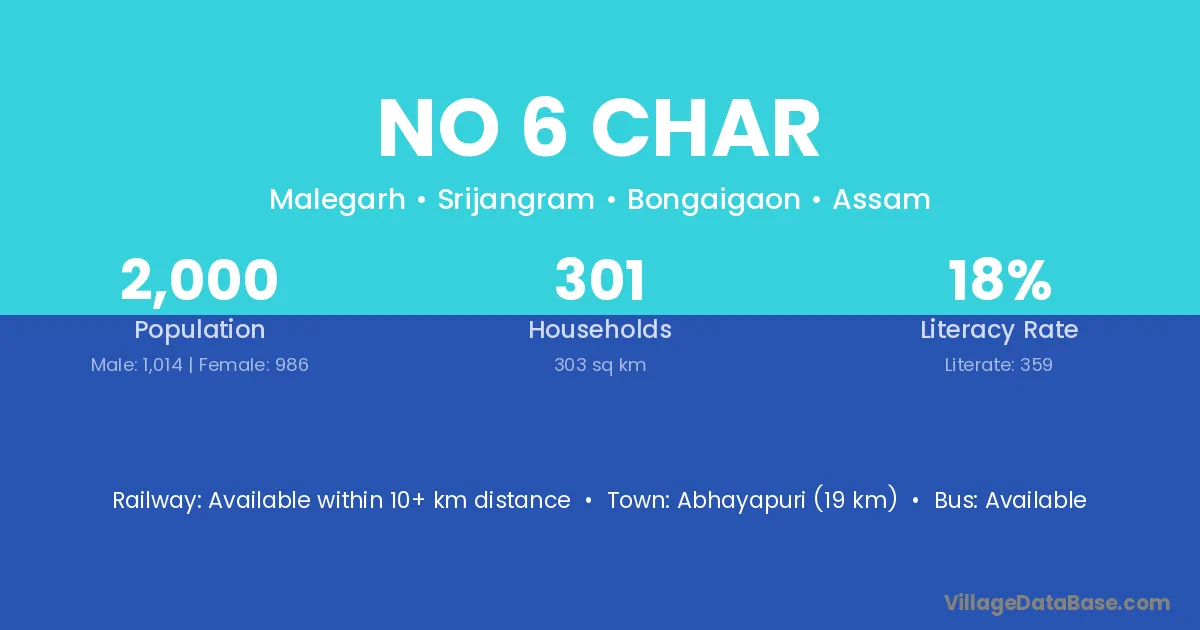 Abhayapuri (19 km) is the nearest town to No 6 Char village for major economic activities and is located approximately 19 km away.