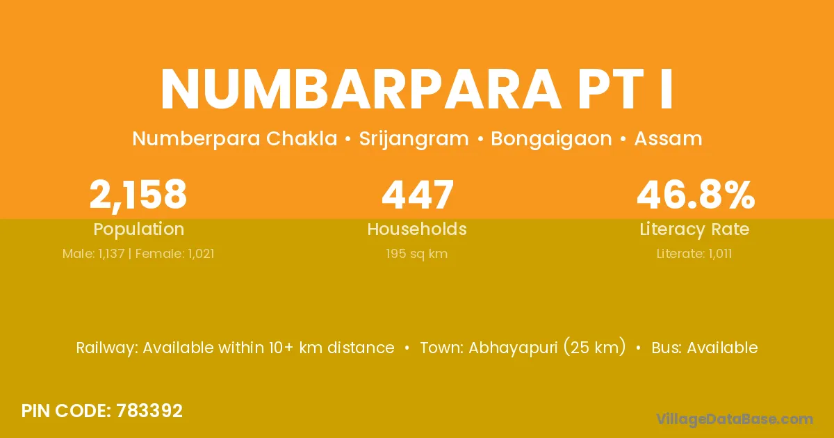 Abhayapuri (25 km) is the nearest town to Numbarpara Pt I village for major economic activities and is located approximately 25 km away.