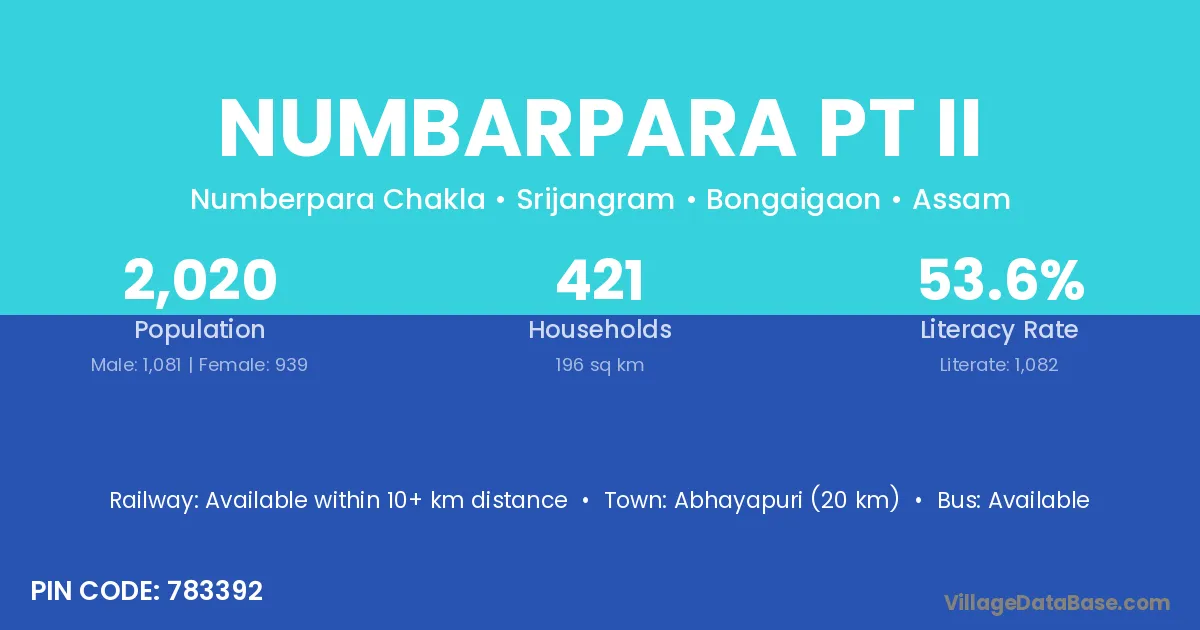 Abhayapuri (20 km) is the nearest town to Numbarpara Pt Ii village for major economic activities and is located approximately 20 km away.