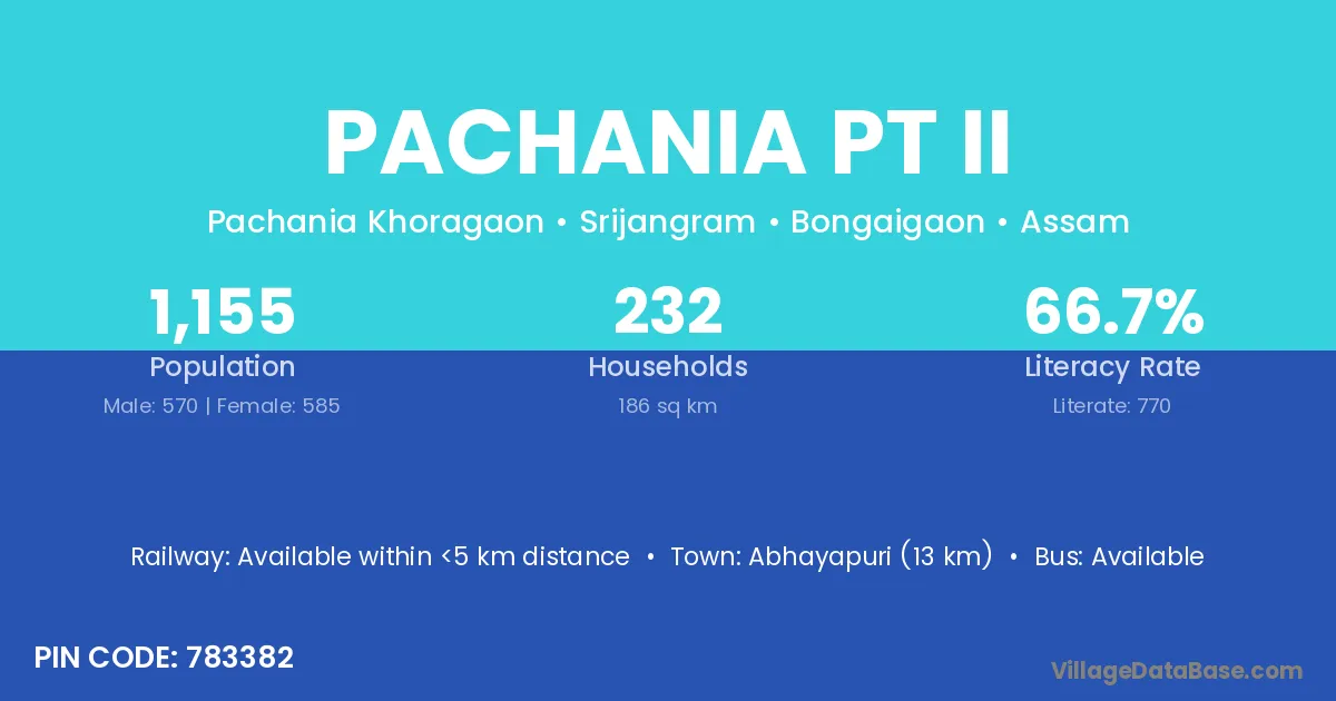 Abhayapuri (13 km) is the nearest town to Pachania Pt Ii village for major economic activities and is located approximately 13 km away.