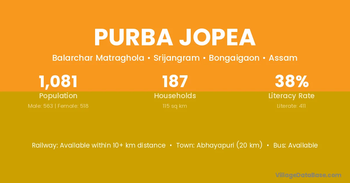 Abhayapuri (20 km) is the nearest town to Purba Jopea village for major economic activities and is located approximately 20 km away.