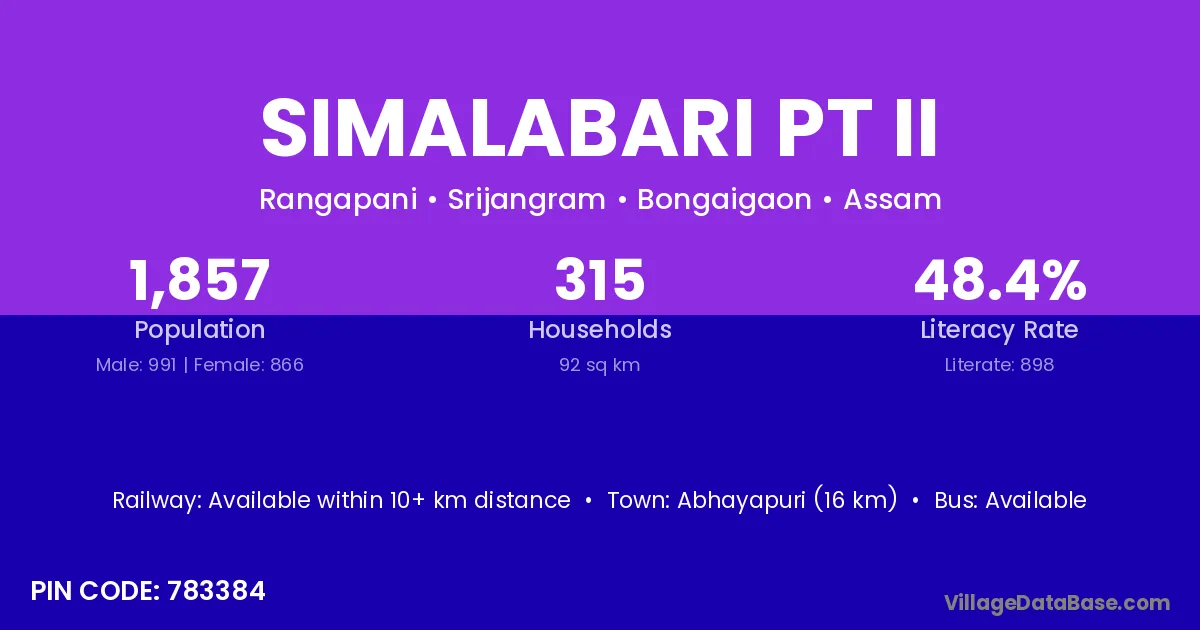 Abhayapuri (16 km) is the nearest town to Simalabari Pt Ii village for major economic activities and is located approximately 16 km away.