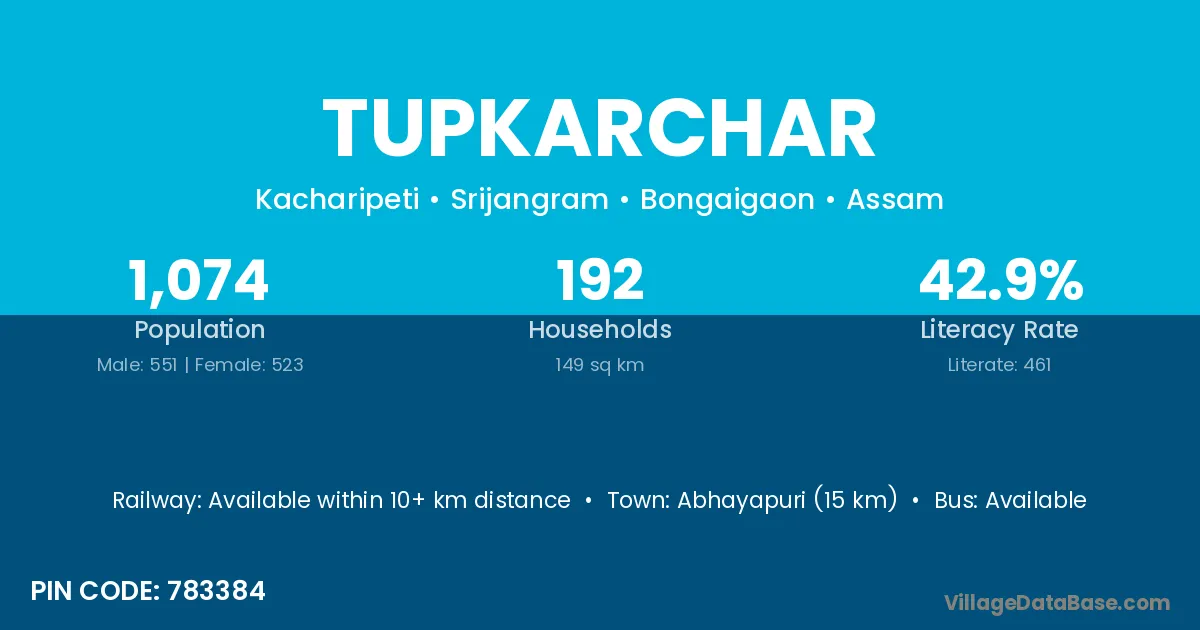 Abhayapuri (15 km) is the nearest town to Tupkarchar village for major economic activities and is located approximately 15 km away.