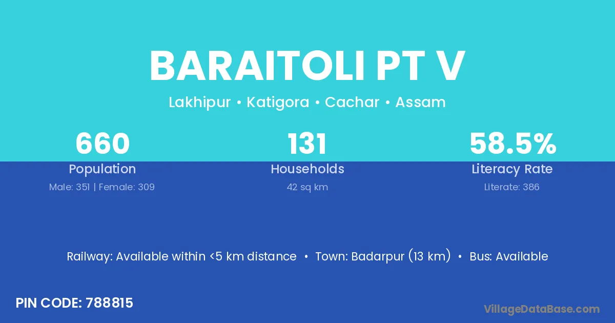 Badarpur (13 km) is the nearest town to Baraitoli Pt V village for major economic activities and is located approximately 13 km away.