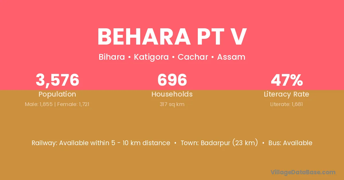 Badarpur (23 km) is the nearest town to Behara Pt V village for major economic activities and is located approximately 23 km away.