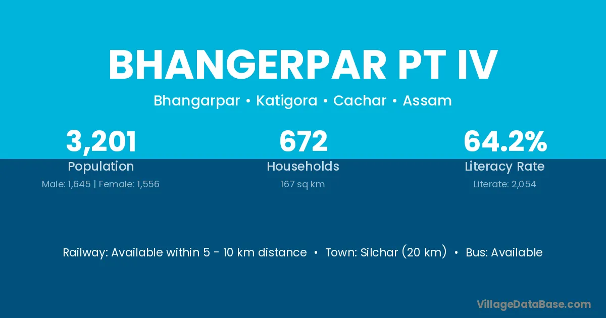 Silchar (20 km) is the nearest town to Bhangerpar Pt Iv village for major economic activities and is located approximately 20 km away.