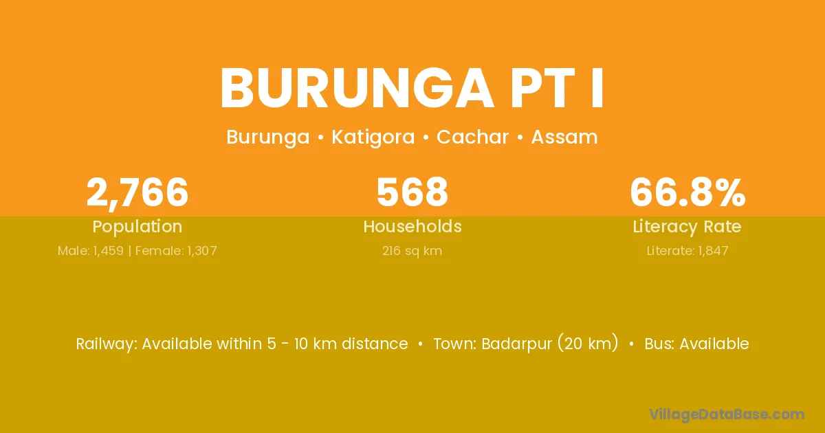 Badarpur (20 km) is the nearest town to Burunga Pt I village for major economic activities and is located approximately 20 km away.