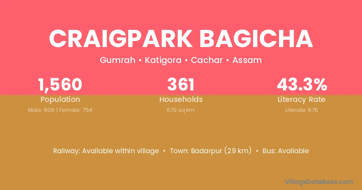 Craigpark Bagicha village has a total population of 1,560 people, of which 806 are males and 754 are females.