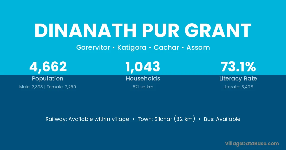 Silchar (32 km) is the nearest town to Dinanath Pur Grant village for major economic activities and is located approximately 32 km away.
