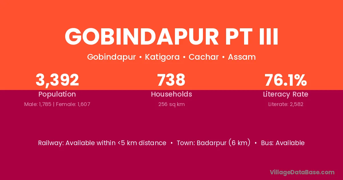 Badarpur (6 km) is the nearest town to Gobindapur Pt Iii village for major economic activities and is located approximately 6 km away.