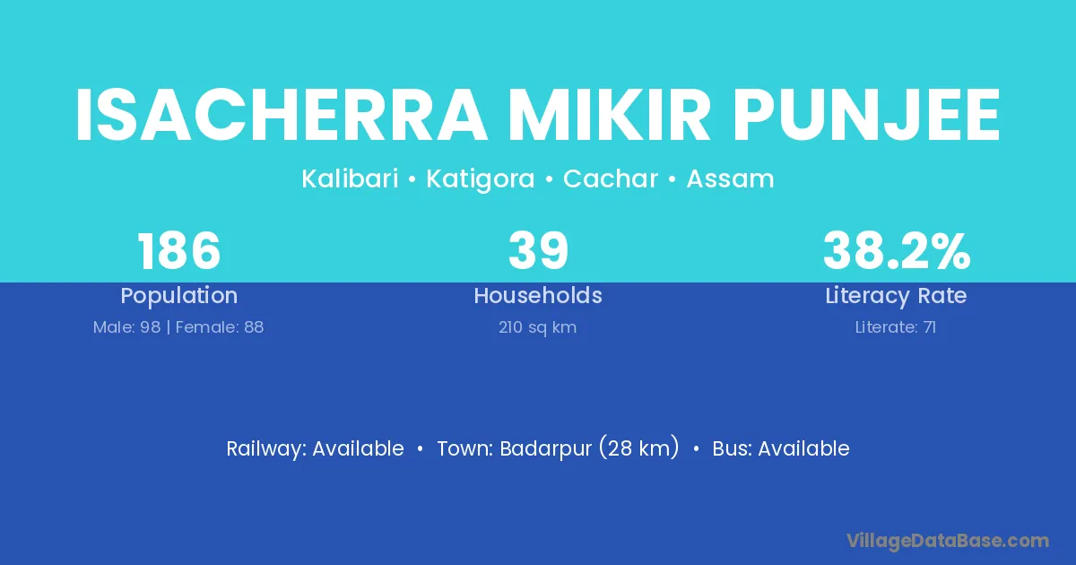 Badarpur (28 km) is the nearest town to Isacherra Mikir Punjee village for major economic activities and is located approximately 28 km away.