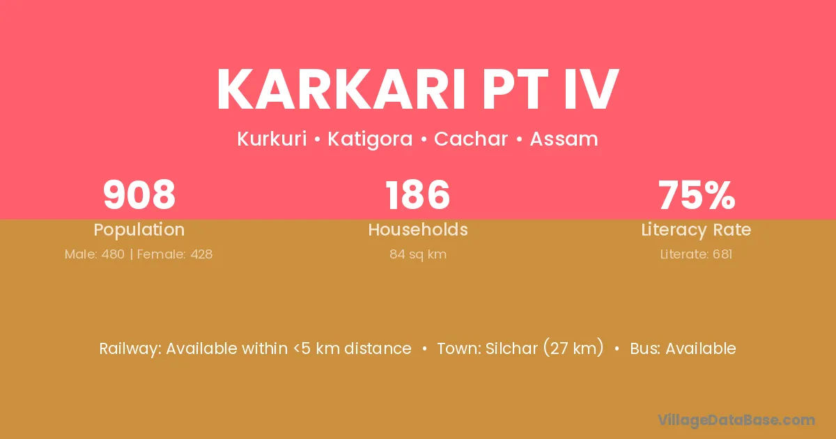 Silchar (27 km) is the nearest town to Karkari Pt Iv village for major economic activities and is located approximately 27 km away.