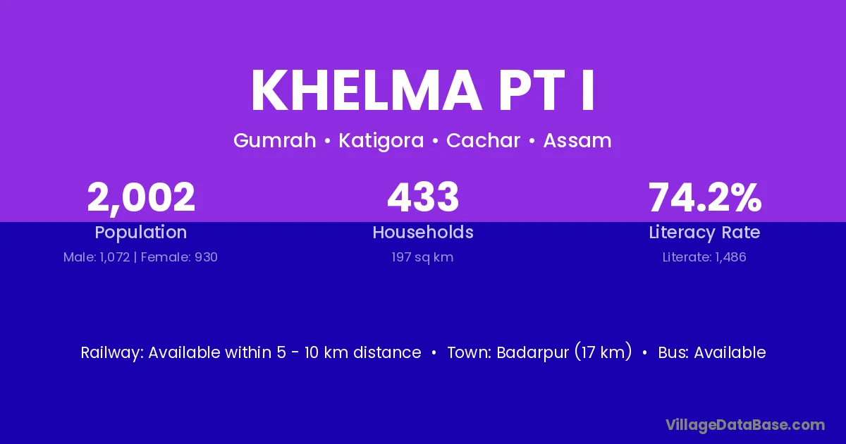 Badarpur (17 km) is the nearest town to Khelma Pt I village for major economic activities and is located approximately 17 km away.