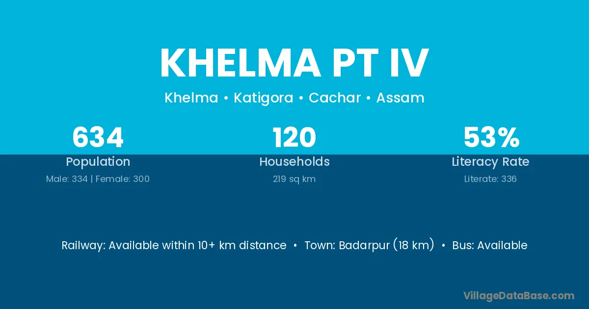 Badarpur (18 km) is the nearest town to Khelma Pt Iv village for major economic activities and is located approximately 18 km away.