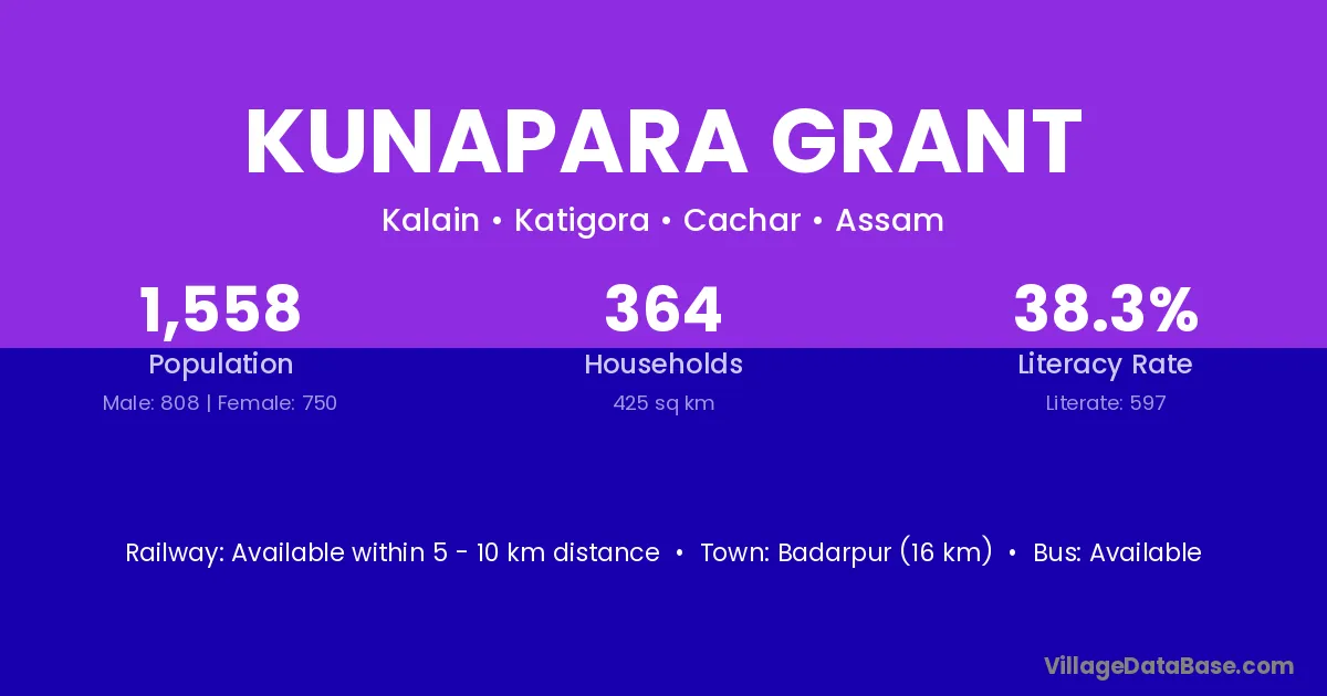Badarpur (16 km) is the nearest town to Kunapara Grant village for major economic activities and is located approximately 16 km away.