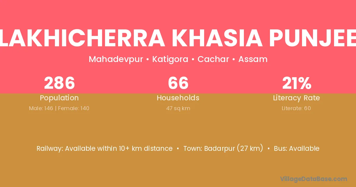 Badarpur (27 km) is the nearest town to Lakhicherra Khasia Punjee village for major economic activities and is located approximately 27 km away.