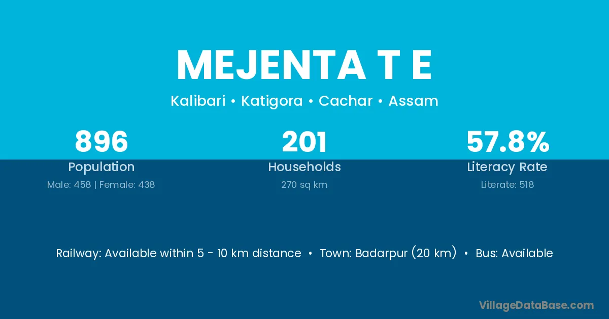 Badarpur (20 km) is the nearest town to Mejenta T E village for major economic activities and is located approximately 20 km away.