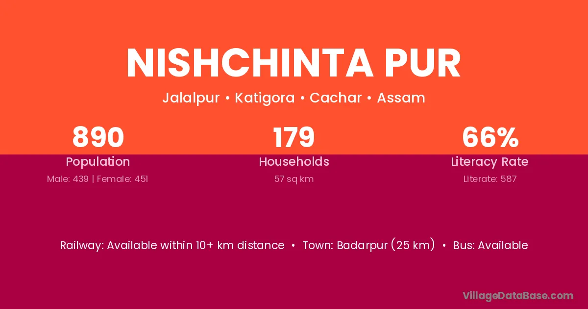 Badarpur (25 km) is the nearest town to Nishchinta Pur village for major economic activities and is located approximately 25 km away.