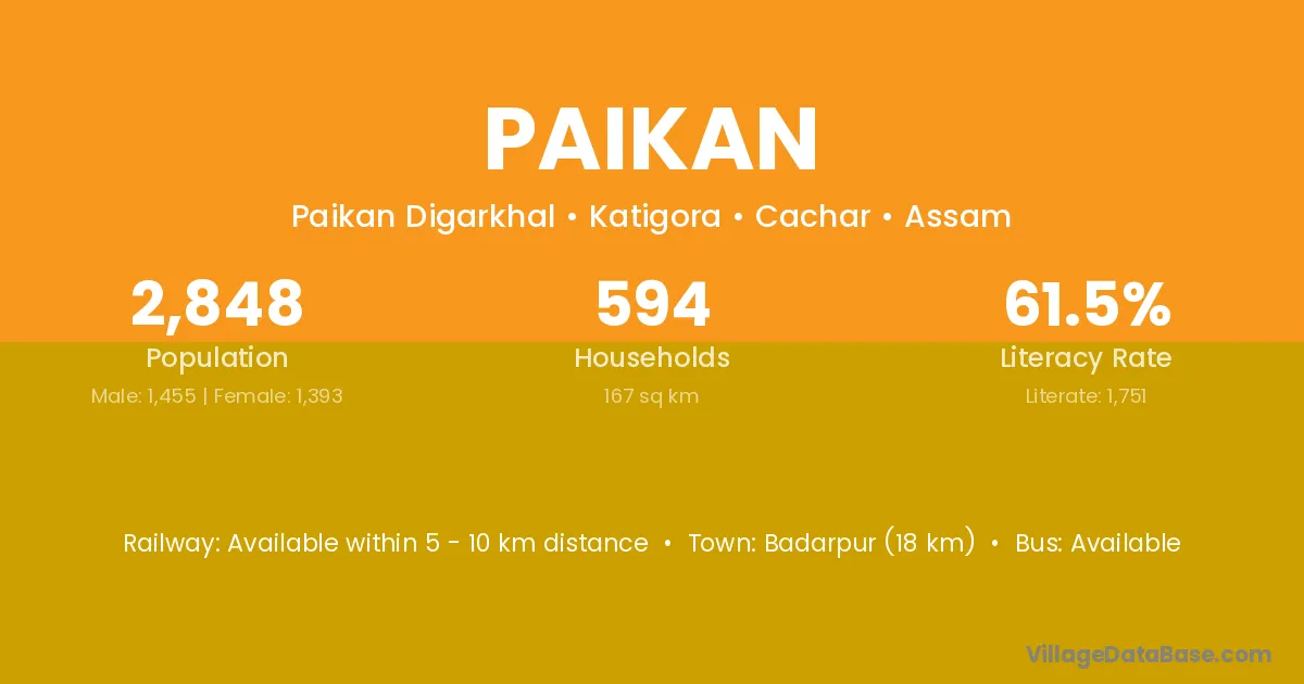 Badarpur (18 km) is the nearest town to Paikan village for major economic activities and is located approximately 18 km away.