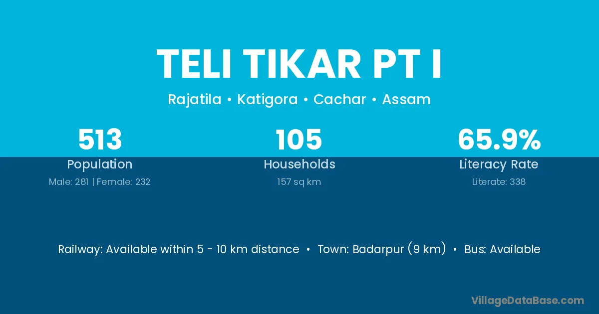 Badarpur (9 km) is the nearest town to Teli Tikar Pt I village for major economic activities and is located approximately 9 km away.