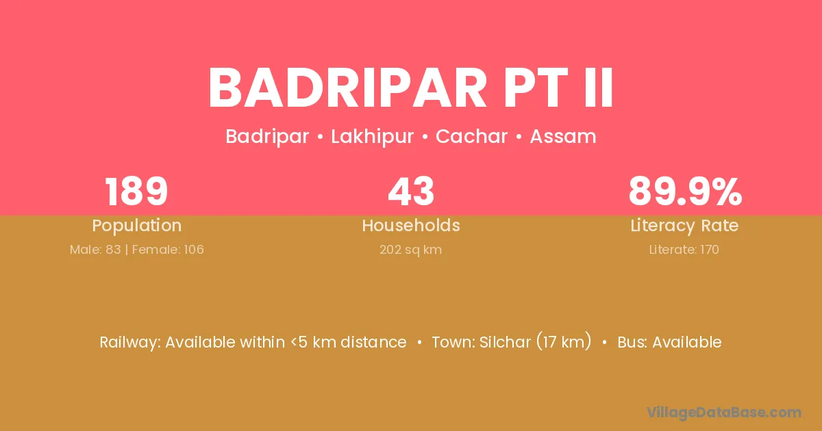 Silchar (17 km) is the nearest town to Badripar Pt Ii village for major economic activities and is located approximately 17 km away.