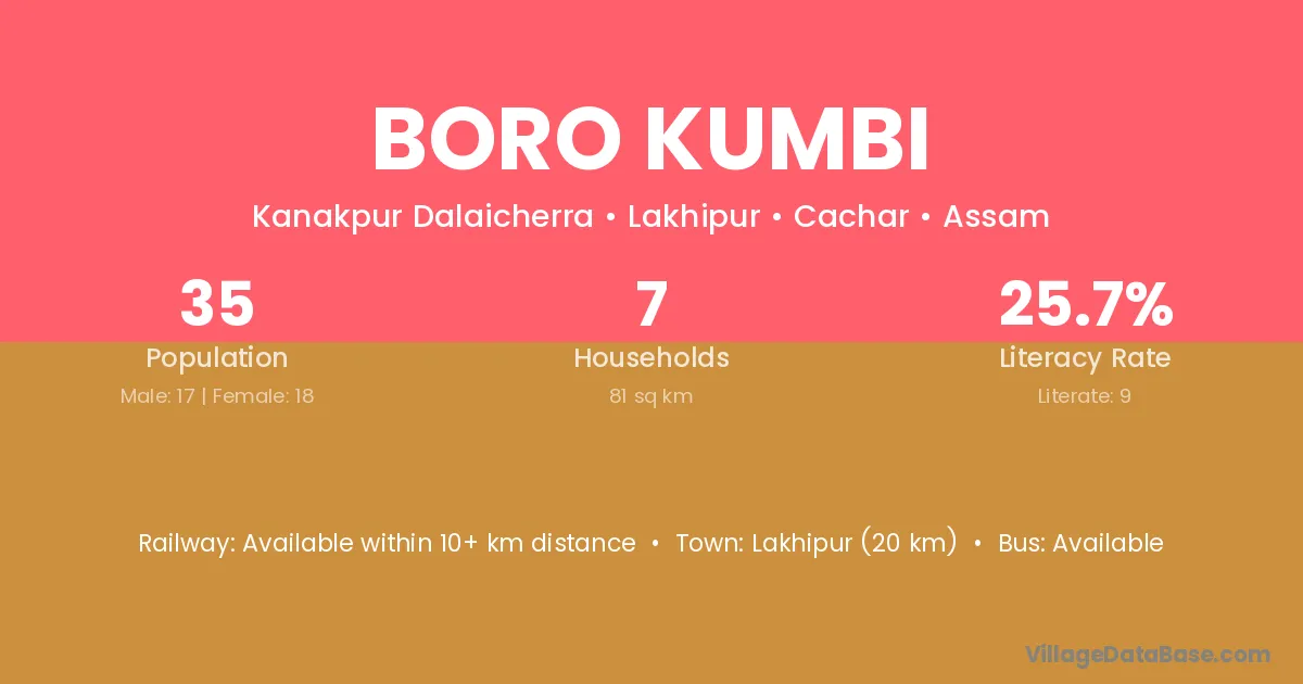 Lakhipur (20 km) is the nearest town to Boro Kumbi village for major economic activities and is located approximately 20 km away.