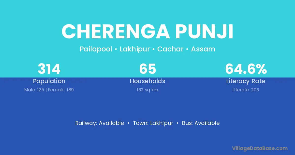 Cherenga Punji village has a total population of 314 people, of which 125 are males and 189 are females.