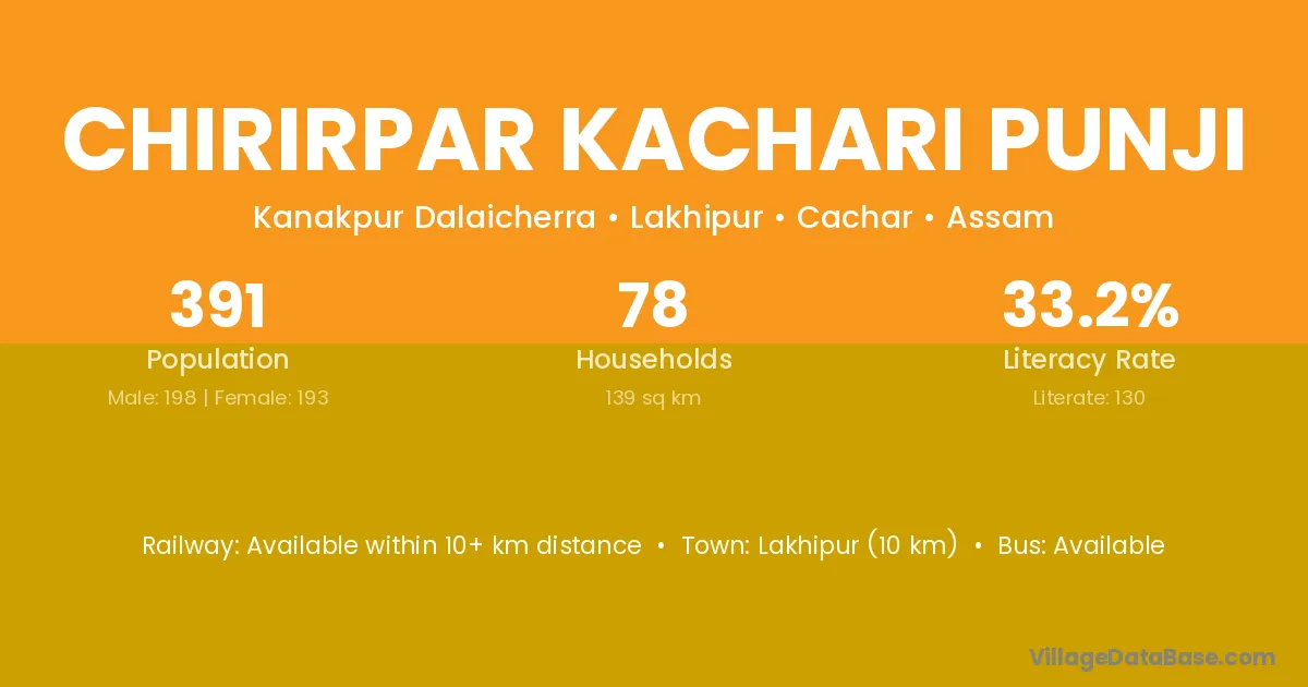 Chirirpar Kachari Punji village has a total population of 391 people, of which 198 are males and 193 are females.
