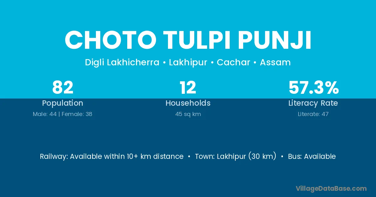 Lakhipur (30 km) is the nearest town to Choto Tulpi Punji village for major economic activities and is located approximately 30 km away.