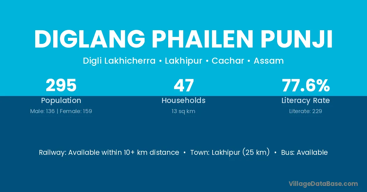Lakhipur (25 km) is the nearest town to Diglang Phailen Punji village for major economic activities and is located approximately 25 km away.